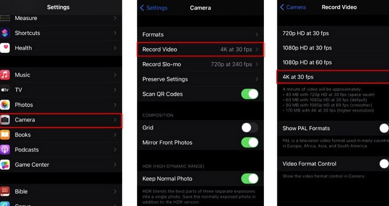 Перейдите в (Настройки — Камера — Видеозапись) и выберите режим 4к при 30 кадрах в секунду. Такой формат обеспечивает детализированные и плавные ролики, которые выглядят профессионально.