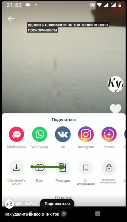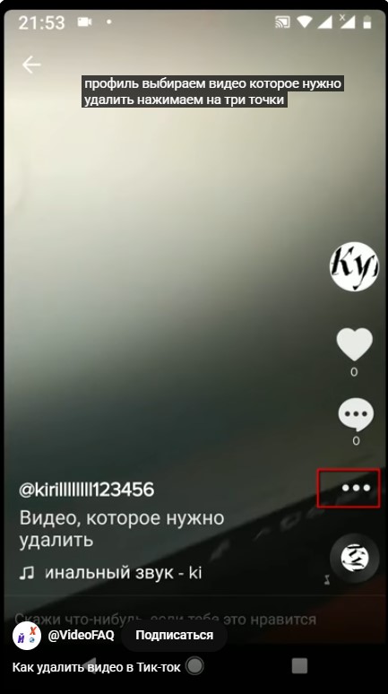 - Выберите видео, которое хотите удалить, и нажмите на три точки под лайками и комментариями справа;