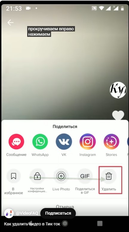 - Откройте каждое видео, нажмите на три точки справа, выберите (удалить) и подтвердите. К сожалению, массовое удаление всех видео сразу невозможно, вам придется удалять их по одному.